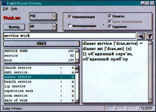 Работать с переводами удобнее всего не из самого RusLan'a, а из Windows-приложений. Хотя возможность передачи данных через буфер обмена имеется, работа пойдет гораздо быстрее, если пересылать текст по "горячему ключу". Вообще же RusLan рассчитан на тесное взаимодействие с текстовыми редакторами.