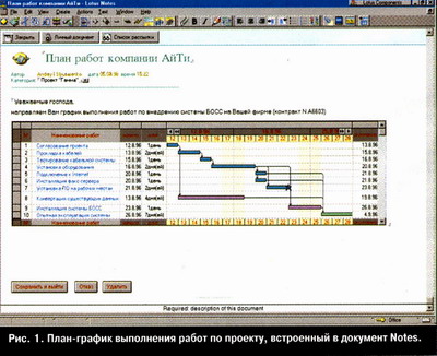Компоненты могут быть включены в любое поле документа Notes, имеющее тип rich text, так, что пользователь может применять предоставляемые средства, не вызывая дополнительных программ-серверов. На рисунке показано, как может выглядеть документ Notes, содержащий информацию о плане выполнения работ по проекту, реализуемому специалистами нашей компании.