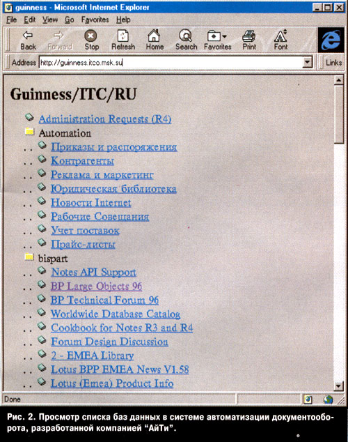 Если 1995 год запомнился как год бурного развития Internet, то нынешний, 1996-й, безусловно, войдет в историю как время ожесточенной борьбы между производителями программного обеспечения для реализации внутрикорпоративных сетей по технологии Internet – так называемых "интранетов". Одним из возможных путей для решения данной задачи является использование технологии Notes, которую, по мнению ее разработчиков, не зледует рассматривать как альтернативу Web-системам: ранее был выпущен InterNotes Web Publisher, позволявший публиковать базы данных Notes в HTML-формате, а в версии 4.0 – и поддерживающий ввод данных в базы Notes на основе заполняемых клиентом форм. Правда, это взаимодействие носило несколько статичный характер, так как пользователи не могли наблюдать непосредственную реакцию системы. Теперь же для доступа к базам Notes достаточно любого Web-браузера, например, Netscape Navigator или Internet Explorer. Это стало возможным с появлением технологии Domino.