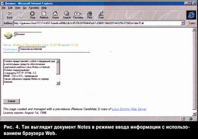 При этом пользователь работает с реальной базой данных. Стоит обратить внимание на применяемый URL-синтаксис (окно адреса в верхней части рисунка, рис. 4), использующий уникальный идентификатор документа в базе Notes. Помимо "навигационного" доступа с применением пользовательского интерфейса Domino поддерживает и специальный формат URL-адресов.