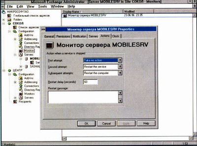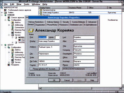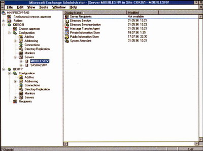 Одной из сильных сторон Microsoft Exchange является простота администрирования. Всего одна программа позволяет администратору с одного рабочего места управлять всей корпоративной системой и ее конфигурацией -почтовыми ящиками пользователей, шлюзами и серверами, находящимися в любом филиале корпорации. Эта программа дает графическое представление всех компонентов системы в виде иерархической структуры, упрощая выполнение основных операций над группой ресурсов на каждом уровне структуры. На первой иллюстрации видно, что организация, в данном случае "МИКРОСОФТ АО", состоит из одного отделения (Site) "СОКОЛ". Администратор может видеть все компоненты сервера, просто выделяя соответствующий сервер (в данном примере это MOBILESRV) на левой панели окна.