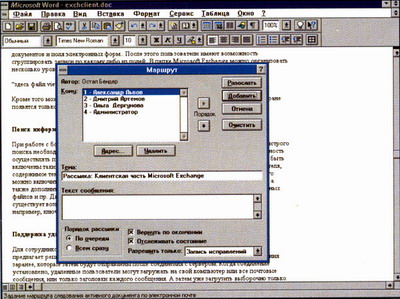 Продукты от Microsoft всегда славились своей глубокой интеграцией друг с другом (о качестве отдельного продукта можно всегда поспорить, но интеграция с другим ПО этой фирмы – дело святое). И новый Exchange – не исключение. Если взять какой-нибудь продукт из Microsoft Office – например, MS Word 7.0, – после установки Exchange в его меню File появятся дополнительные пункты: "Отправить", "Поместить в папку" и "Добавить в маршрут". Последний – простое решение проблемы документооборота при помощи только Exchange и Word. Вызвав эту функцию, можно сразу из редактора задать документу маршрут и права на этот документ для остальных пользователей. Изменив только один флажок, можно сделать Word редактором текстовых сообщений для самого Microsoft Exchange.