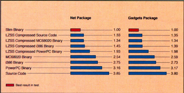 Juice-кодом. Взгляните на результаты тестов, которые проводились для двух наиболее объемных пакетов системы Oberon: это Gadgets (пользовательский интерфейс; 2,3 Мбайт исходного текста) и Net (сетевые функции, 0,7 Мбайт). На диаграмме указан приведенный размер кода.
