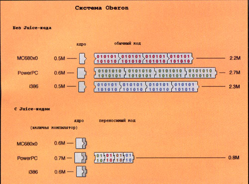 Как показали эксперименты, для достаточно объемных приложений время подобной загрузки возрастает от 1,3 до 5 раз в зависимости от приложения и оборудования. Однако здесь гораздо показательней не абсолютная, а относительная оценка. Так, вся система Oberon загружается на Pentium-166 за 2,1 секунды с обычным исполняемым кодом и за 3,8 секунды с