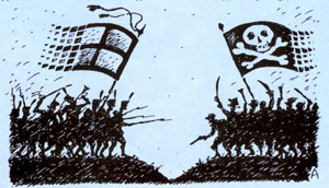 После посещения пресс-конференции от 11 июля, посвященной началу активных действий Управления по экономическим преступлениям ГУВД Москвы против компьютерных пиратов, у меня создалось впечатление, что с "серым" рынком действительно начинается серьезная борьба. Из головы, правда, никак не вылезал аналогичный случай с фирмой "1C", которая год назад судилась из-за своей "Бухгалтерии" с небольшой торговой фирмой. Тогда все это напоминало армейские учения с холостыми патронами -постреляли, вроде даже шума и дыма было много, а победителей и проигравших нет. Доказала на суде "1C" факт продажи смехотворного количества копий, наложили на фирму небольшое взыскание – и всё.