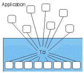 Figure 1: When Tcl is embedded in an application, it provides basic programming facilities that form the core of a command language for the application. The application then adds its own functions into the Tcl interpreter as extensions.
