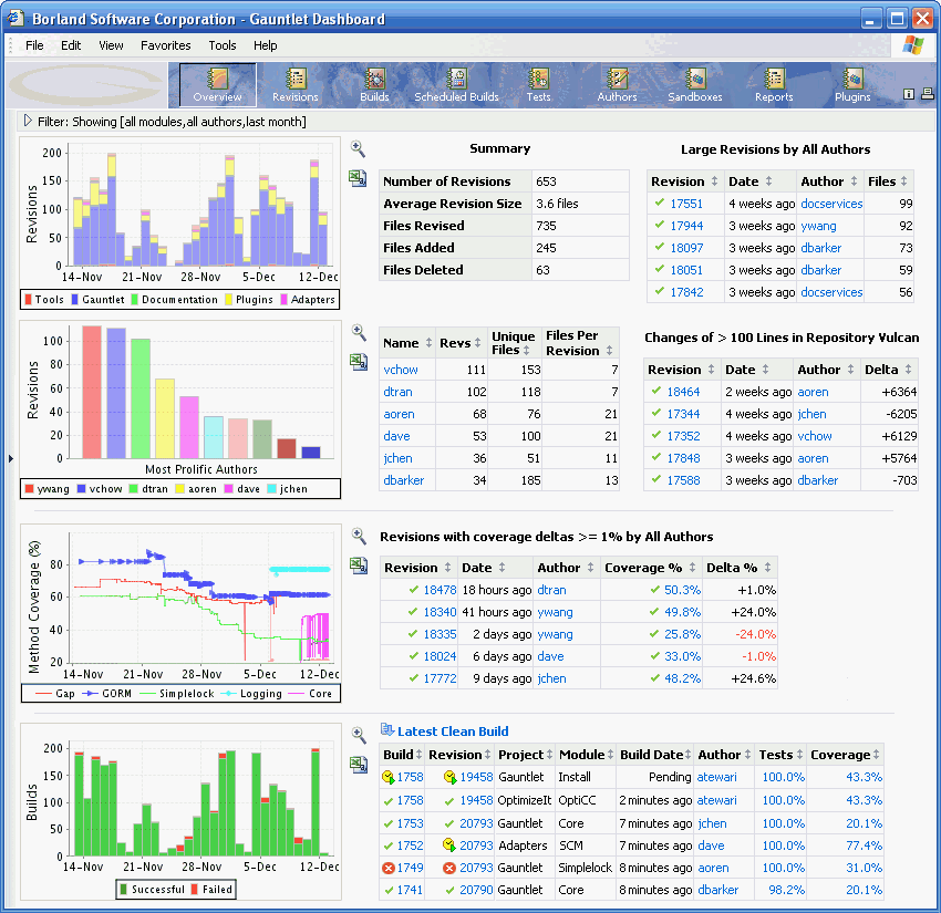 The first Borland toolset that fully encapsulates these principles is an automatic, server-side continuous build tool appropriately named "Gauntlet" (www.borland.com/us/products/silk/gauntlet). In addition to almost instant application builds and results reporting upon code check-in, Gauntlet can integrate with three types of version control systems (CVS, Subversion, and Borland's own StarTeam) and several automated test suites including Mercury TestDirector and Borland's SilkCentral Test Manager (www.borland.com/us/products/ silk/silkcentral_test).