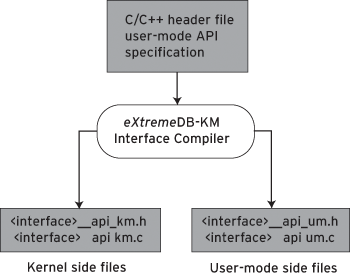 To facilitate the implementation of the "indirect" system call API, eXtremeDB-KM provides a simple "interface compiler" utility. This utility is similar to that of a standard remote procedure call compiler, except it generates the user/kernel mode interface files instead of remote access stubs. Developers define the API for C functions that the user-mode applications use to access the kernel-mode database. The eXtremeDB-KM interface compiler generates interface files that implement the user-to-kernel-mode interface through the generic ioctl function. In particular, the interface compiler generates stub files that should be linked with the user-mode applications and the kernel-mode stubs that are included into the kernel module (Figure 3). The generated files encapsulate the user-to-kernel-mode transition and hide ioctl-based implementation details from kernel modules and user-mode applications.