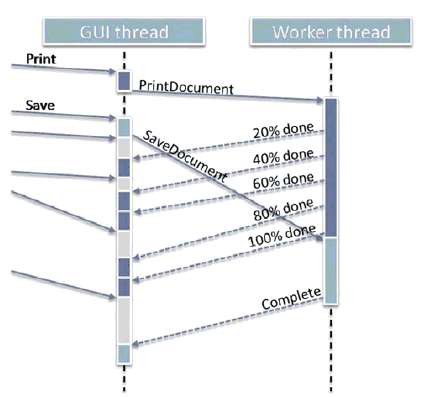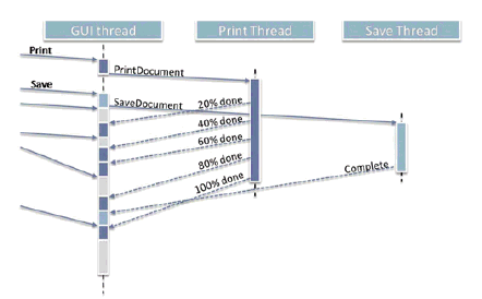 // GUI thread // while( message = queue.Receive() ) { // this could block if( it's a "save document" request ) { TurnSavingIconOn(); worker.Send( new SaveMsg() ); // send async request } else if( it's a "save document" completion notification ) { TurnSavingIconOff();// receive async // notification } else if( it's a "print document" request ) { TurnPrintingStatusOn(); worker.Send( new PrintMsg() ); // send async request } else if( it's a "print document" progress notification ) { if( percent < 100 ) // receive async // notification DisplayPrintPercentComplete( percent ); else TurnPrintingStatusOff(); } else ... } // Dedicated worker thread: Just interprets // the tags on its queue and performs the // appropriate action for each tag. // while( message = workqueue.Receive() ) {// this could block if( it's a "save document" request ) SaveDocument(); // now sends completion // notification else if( it's a "print document" request ) PrintDocument(); // now sends progress // notifications else ... // etc., and check for // termination }