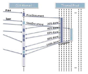 Figure 1 shows an example of this arrangement, where the user presses Print (dark blue) and then Save (light blue), and the two pieces of work are delegated to the worker where they can run asynchronously while the user continues to perform other operations such as moving windows or editing text (gray).