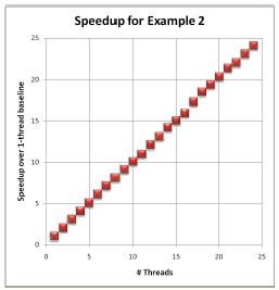 Could such a small change really make a big difference in scalability? Let's measure and find out. When I ran the code in Example 2 with values of P from 1 to 24 (on a 24-core machine), I got the results shown in Figure 4.