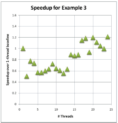 Alas, Example 3 is roughly just as bad as Example 1, and with more erratic performance behavior to boot. Even with half the workers performing only reads of their result[p], even at P = 23 we get about the same performance as when P = 1.