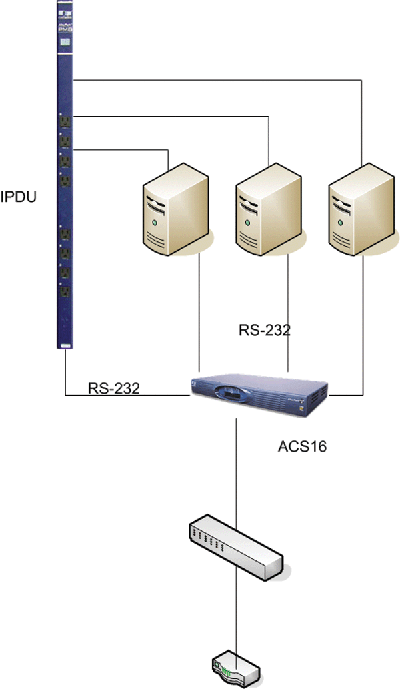 Figure 2 The Cyclades ACS16 installed with an IPDU for power management of the remote servers. The connections from the IPDU to the servers are the servers' AC power connections. The RS-232 link between the IPDU and the ACS16 allows control of a servers power from the same interface used to remote console.