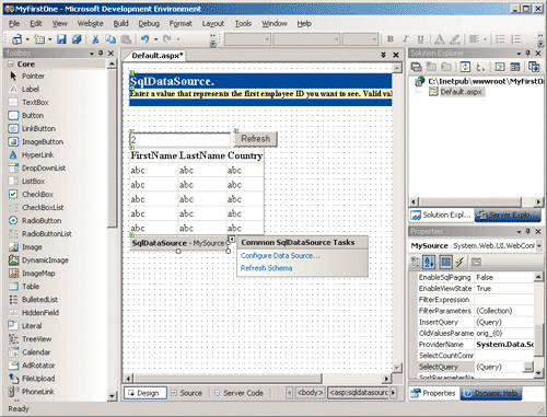 SqlDataSource is a data source control that represents a connection to a relational data store such as SQL Server, Oracle, DB2, or any data source accessible through OLE DB and ODBC bridges. For the control to work, it is essential that a .NET managed data provider exists and that the data source can return SQL resultsets. As mentioned in Figure 3, a separate data source control is available to connect to Access databases.