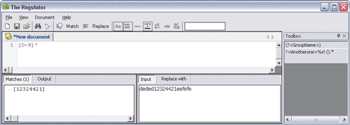 Regulator allows you to enter a regular expression and some input against which you would be running this expression. This way you can see how the regular expression will act and what kind of matches it will return before implementing it in your application. Figure 2 shows Regulator with a simple regular expression.