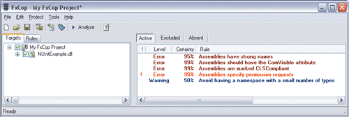 So let's take a look at FxCop in action and see what it finds wrong with the NUnitExample assembly that I have been working with. When you open FxCop you first need to create an FxCop project and then add to it the assembly that you want to test. Once the assembly is added to the project, you can press Analyze, and FxCop will examine the assembly. The errors and warning found in this assembly are shown in Figure 6.