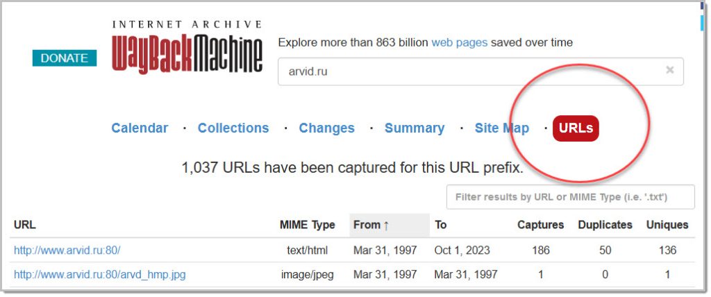 One of my goals was to gather as much ArVid-related software and lore as possible. This was challenging, because most sites from 1995-1999 are now gone or have changed significantly. The Internet Archive’s Wayback Machine was indispensable in my research, because it keeps copies of old webpages and files. One useful trick for old websites: enter the name of the website, then click on the “URLs” option to list all available files in the archive. Sort oldest to newest, and you’ll discover a variety of files + pages that you may not be able to find by clicking around on the homepage.
