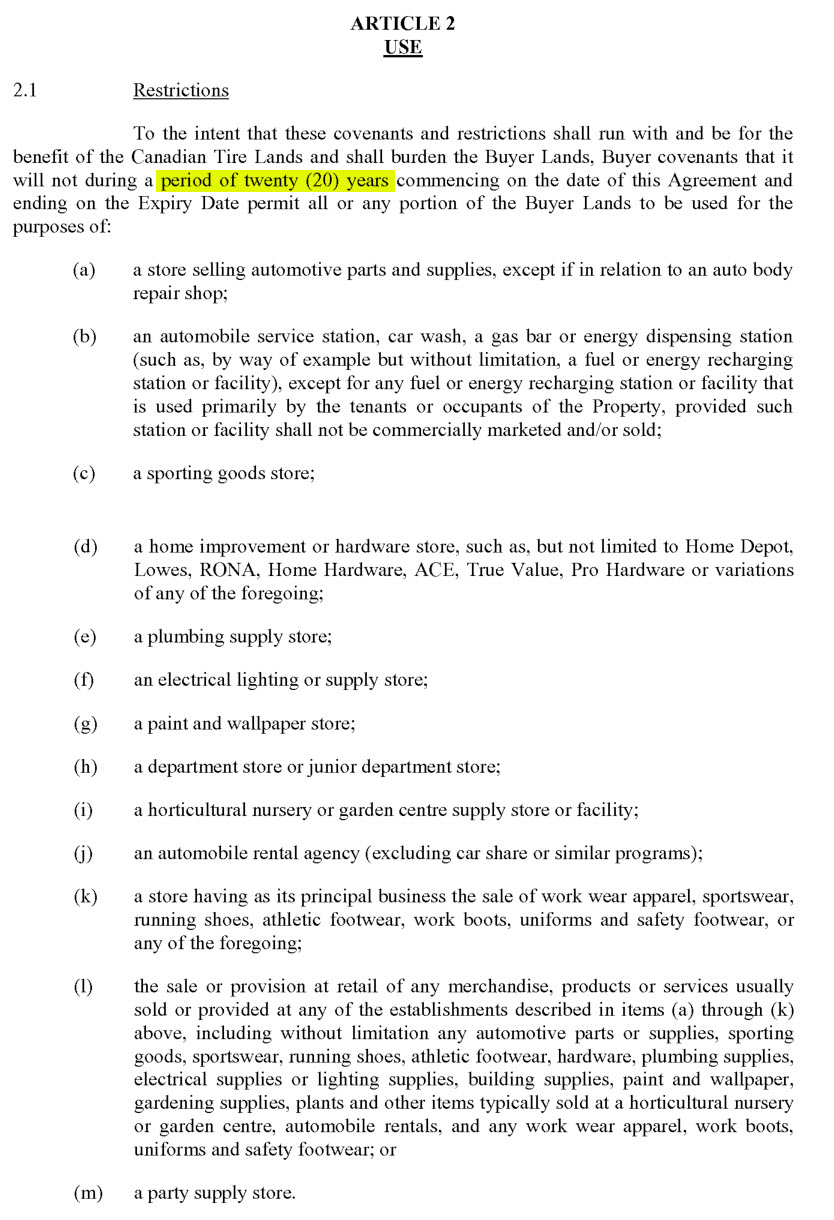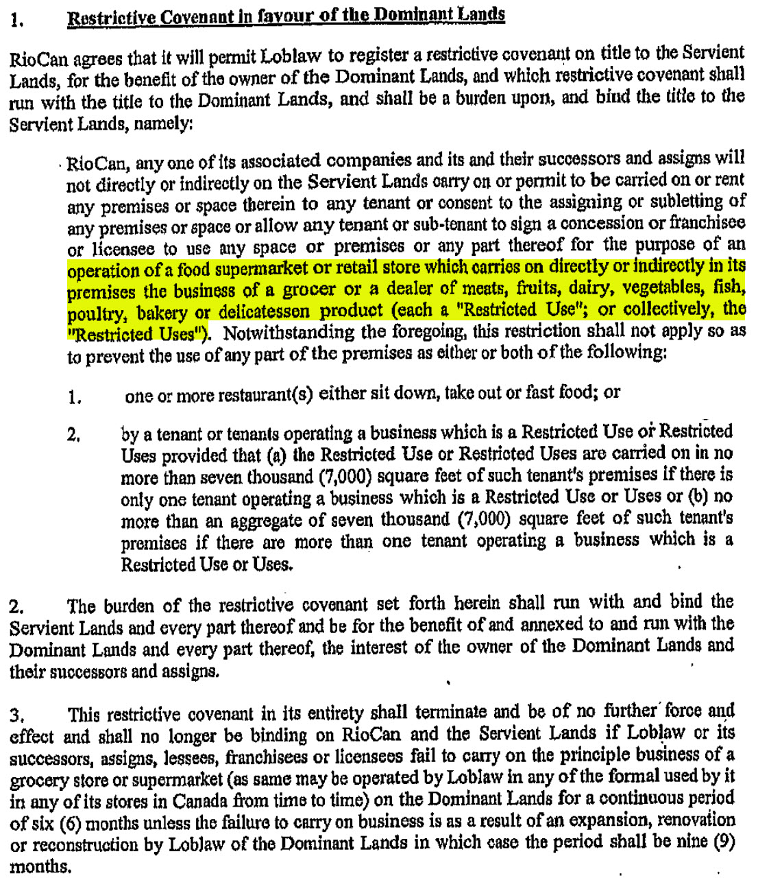 The highlighted passage shows the kinds of activities that are restricted. Section 2 illustrates the power of a Restrictive Covenant to bind future owners of the land. The restrictions are in place as long as Loblaws is operating on the property, and for 6 months afterwards – which makes it one of the more reasonable covenants on this page.