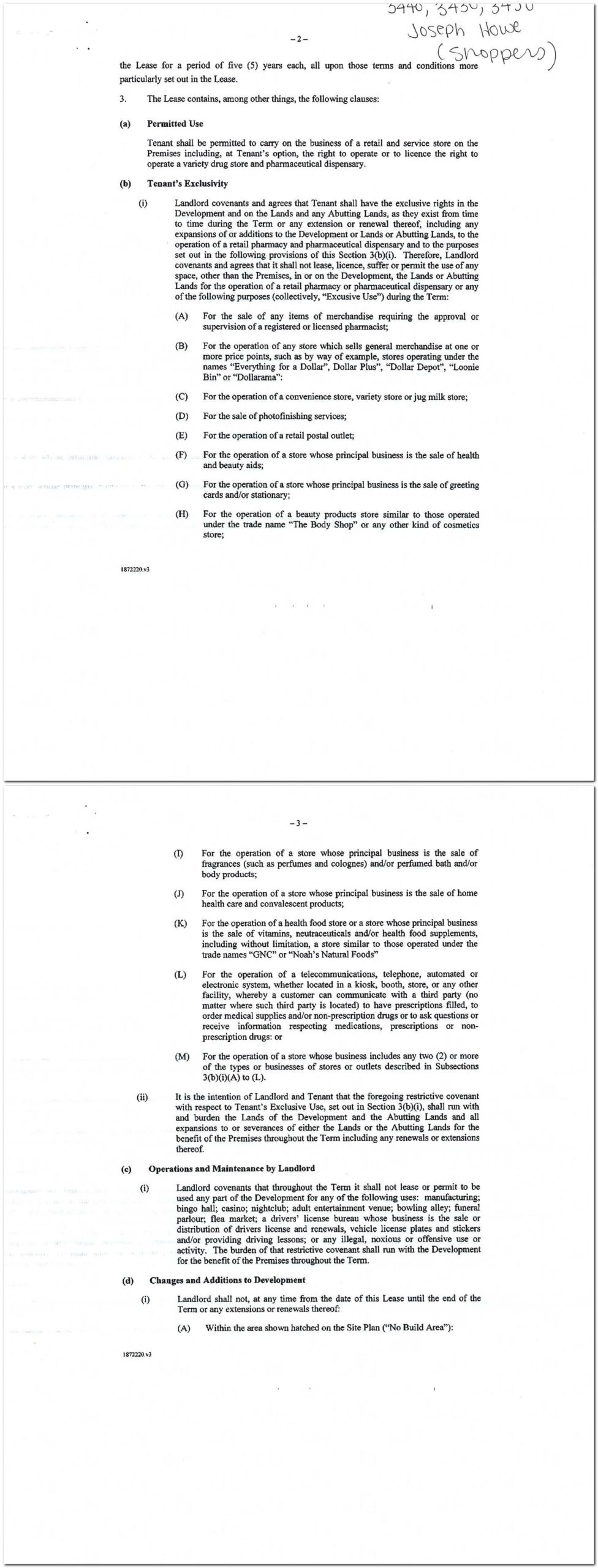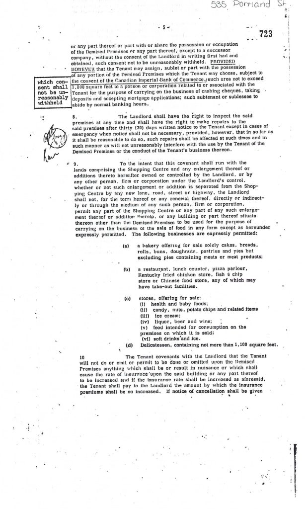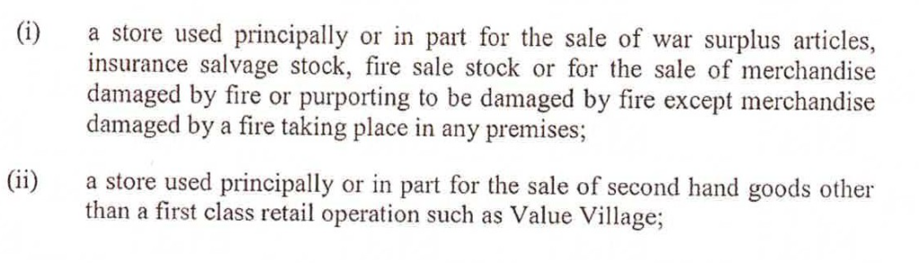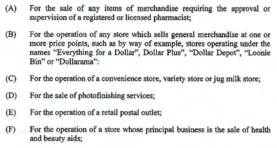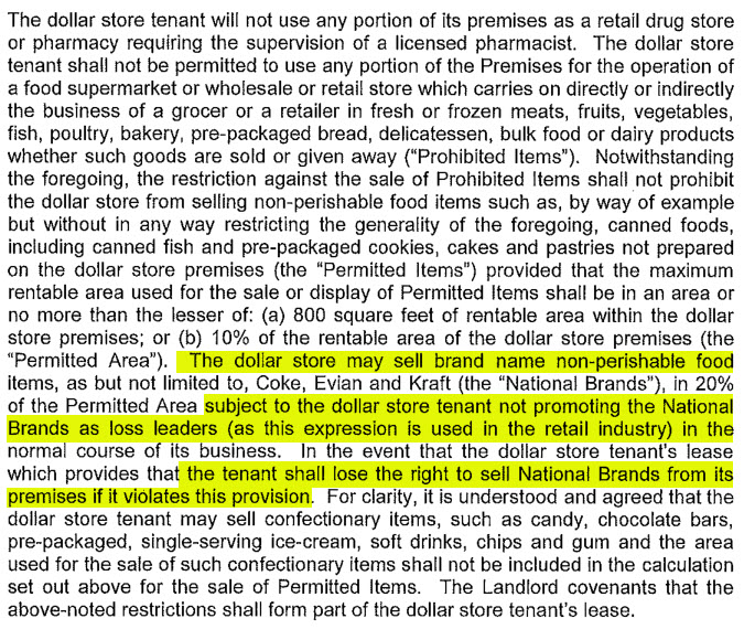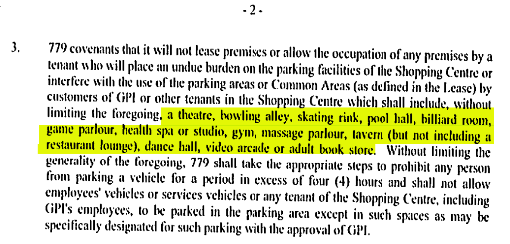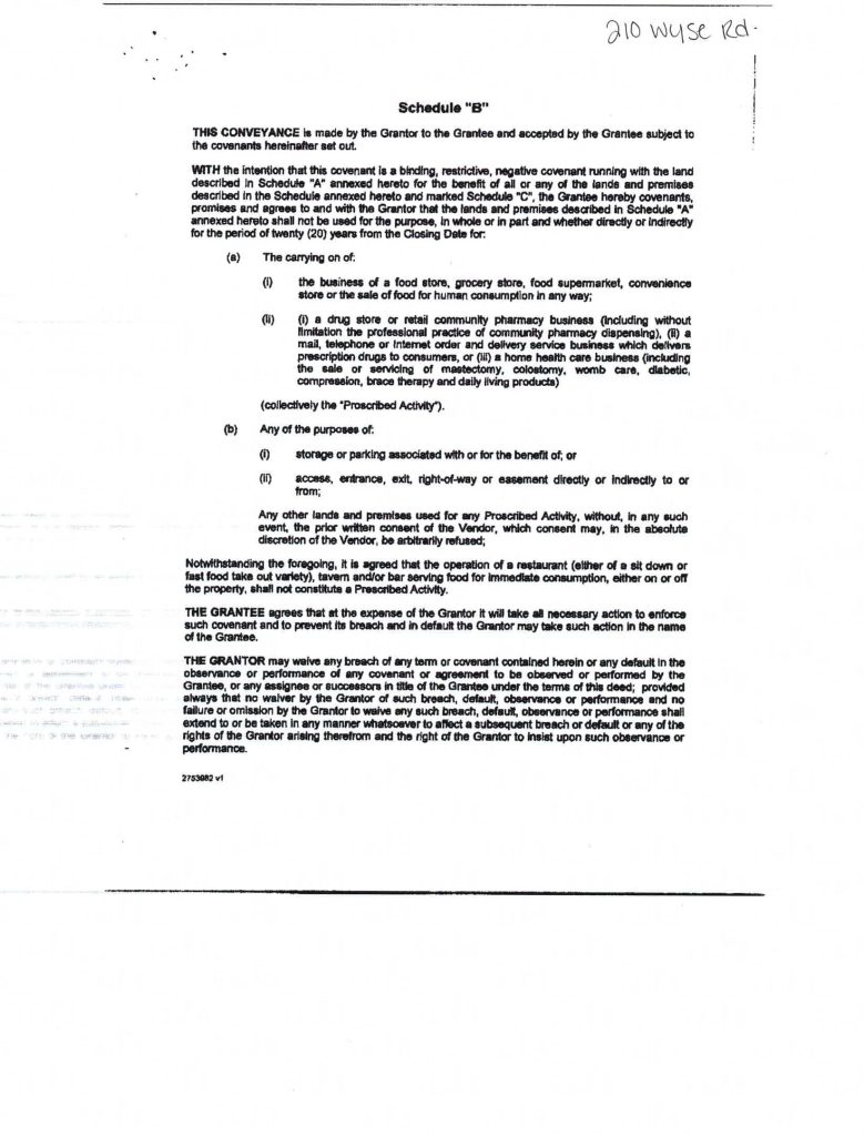 This is a covenant with Shoppers, which restricts what kinds of other tenants the landlord can rent to for the duration of the lease. The full list of forbidden businesses is extreme – dollar stores, photo shops, postal outlets and beauty shops are just some of the businesses that Shoppers won’t tolerate on the plaza.