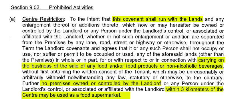What’s interesting is that this one lease also blocks the Landlord from leasing property to any other grocer within a 2 Kilometre radius of the shopping centre. The landlord in this case is CP REIT – Canada’s largest real estate investment trust, and you can bet that they own land nearby*.