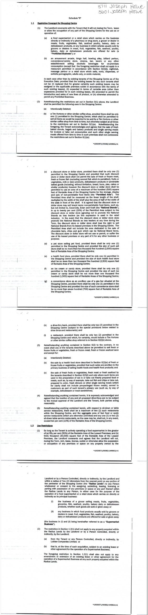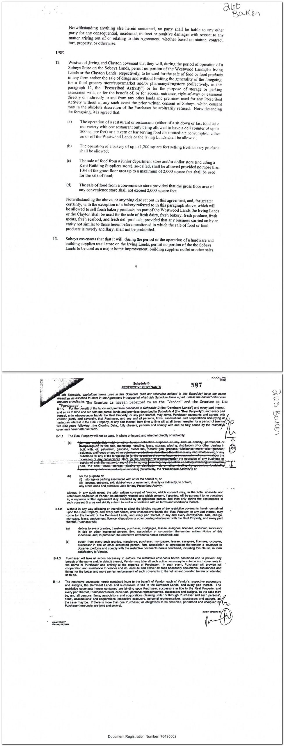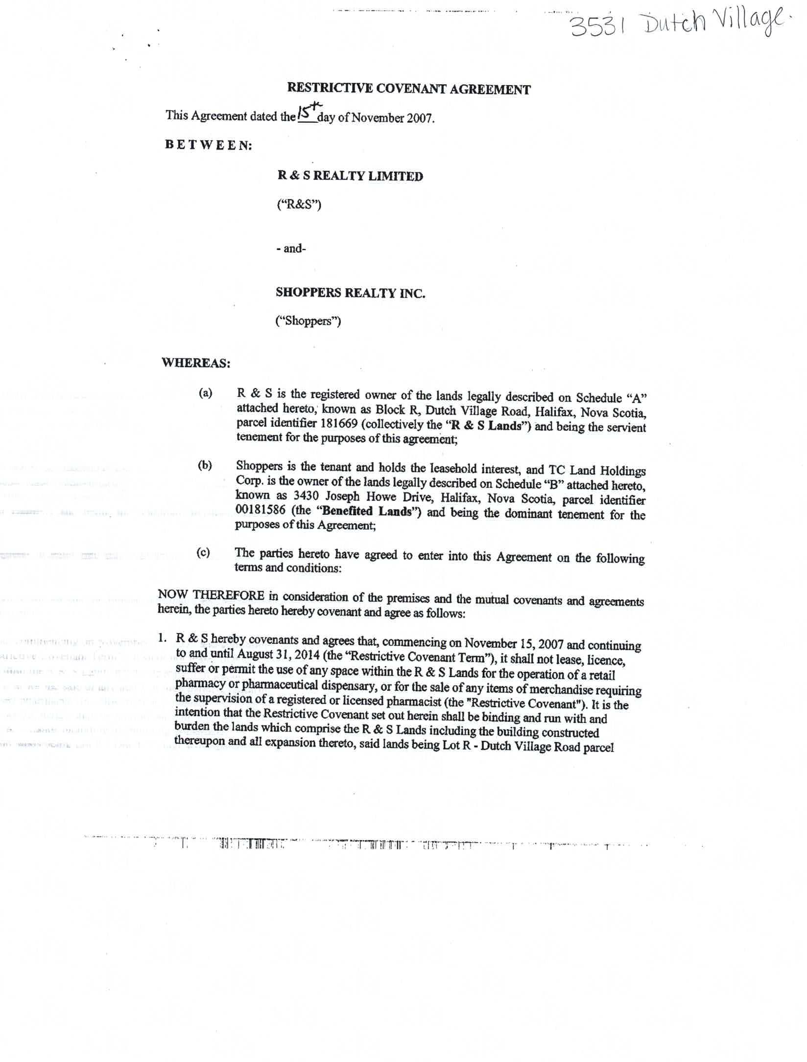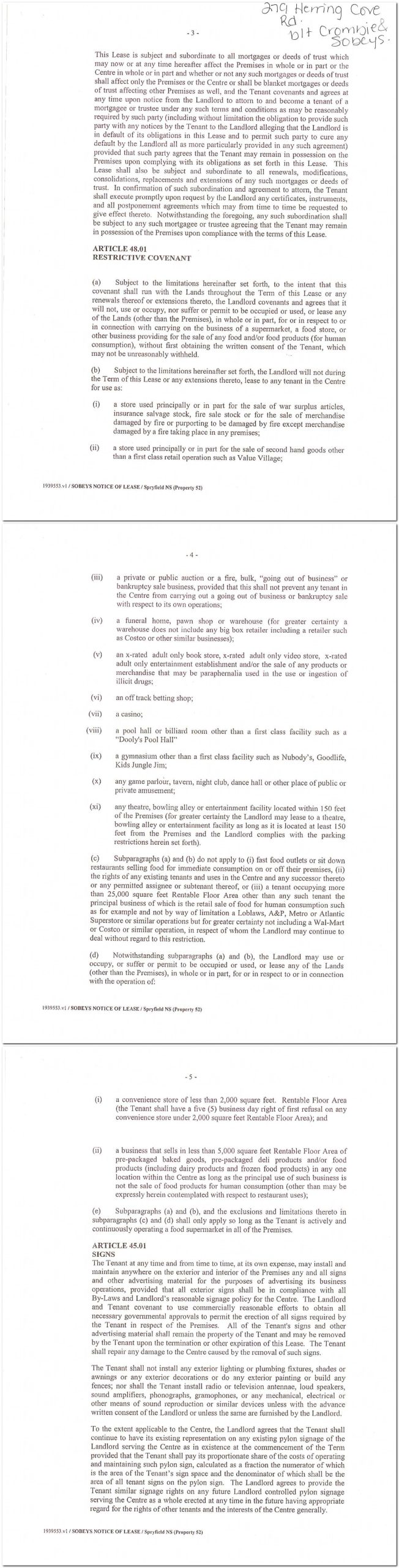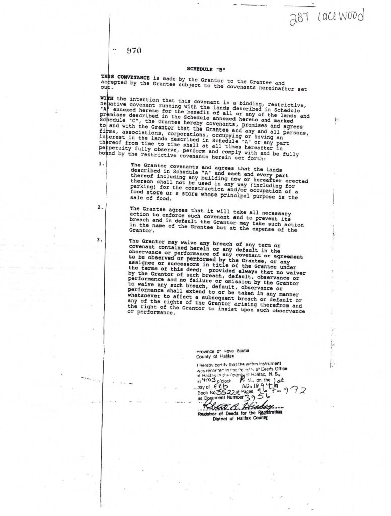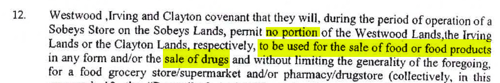 This is a Sobeys contract preventing the sale of groceries or drugs on the plaza. The covenant refers to Irving, Westwood and Clayton lands. I did not purchase the entirety of this document, but I wonder if the mention of these 3 parties means that the covenant covers a bigger area than just the plaza.