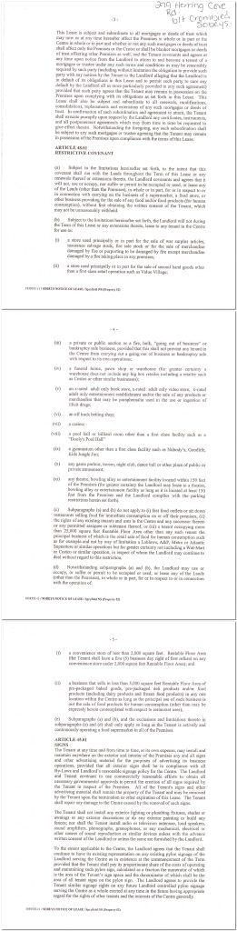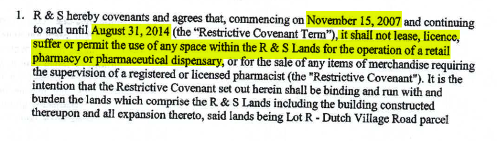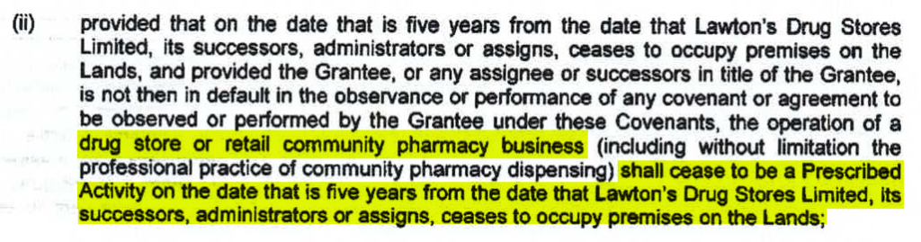 In this one, Lawton’s Drug Stores Limited blocks the landlord from allowing the land to be used as a grocery or a pharmacy. Only 5 years after Lawton’s leaves the strip mall, will the landlord be allowed to rent to another drugstore.