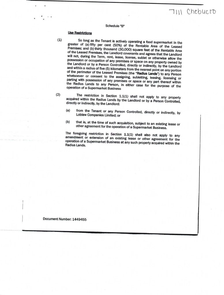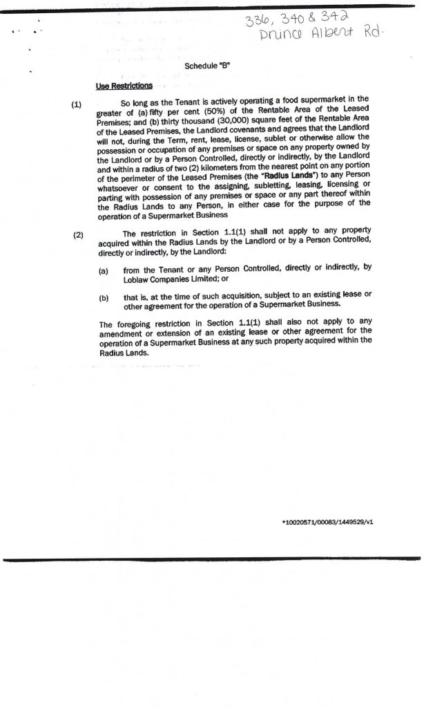 In this shopping plaza, none of the other tenants are allowed to sell food or non-alcoholic beverages without Sobey’s permission. There is also a 3 Kilometre radius restriction placed on Picton Properties Inc. – they can’t rent their other land to a grocer.