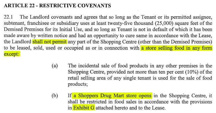 This is a fantastic example of the fiction inherent in REITs – they’re supposedly neutral land-holding vehicles. In reality, these covenants favour Loblaws and shape the operations of the mall around this tenant. CP REIT is absolutely not independent of Loblaws when they’re allowing these sweetheart deals.