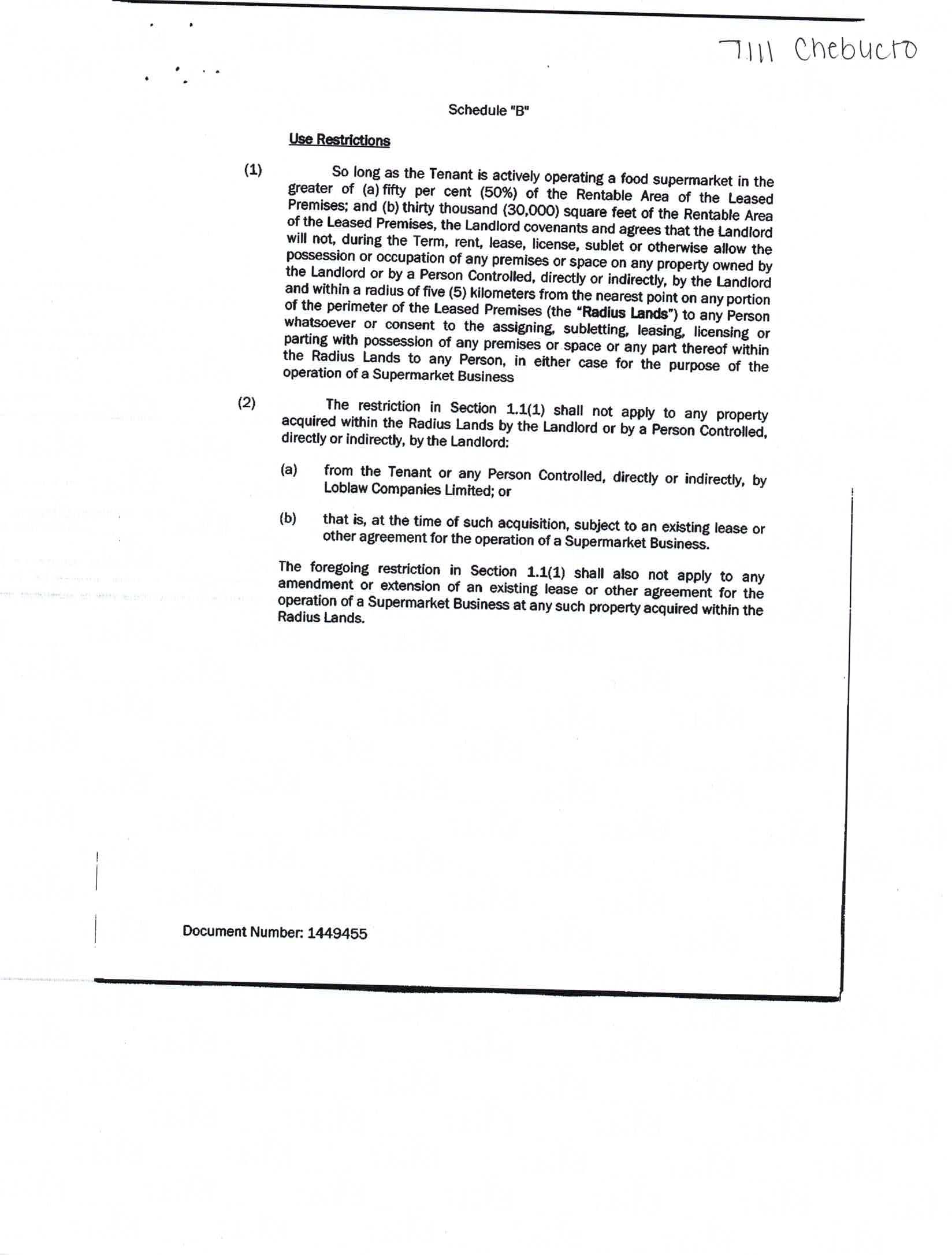 Restrictive Covenants Each of the Loblaw Leases will include a radius restriction pursuant to which the REIT will agree that the REIT and any person controlled directly or indirectly by the REIT will not lease to third parties other premises on lands located within a specified radius of the leased premises (the ‘‘Radius Lands’’) for use as a food supermarket or grocery store (‘‘Supermarket Business’’). This restriction will not apply to properties acquired by the REIT, or a person controlled directly or indirectly by the REIT, (i) from Loblaw Companies Limited or any person controlled directly or indirectly by Loblaw Companies Limited, or (ii) that at the time of such acquisition are subject to an existing lease to a Supermarket Business. The restriction shall also not apply to any amendment or extension of an existing lease to a Supermarket Business within the Radius Lands.