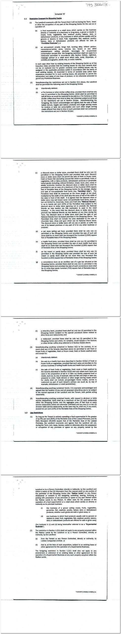 Another deal between Loblaws and CP REIT on a strip mall. This one is different from Loblaws’s standard covenants because it prevents CP REIT from renting to another grocer in a 5 Kilometre radius (instead of a 3k radius).