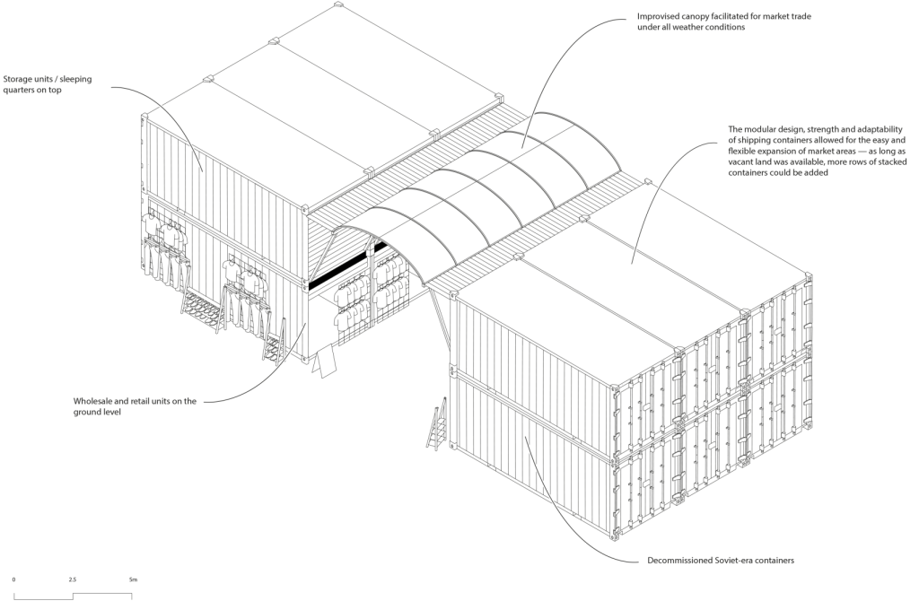 And there’s a fascinating analysis of how the vast, vast market was constructed. It was made of storage containers that were piled in 2 storeys. The bottom container was the shop, and the top was living quarters. The path between the containers was covered with a lightweight canopy to protect shoppers from the weather.