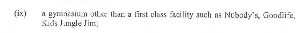 This is a Sobey’s covenant, preventing the property owners from leasing to another grocery during the duration of Sobey’s tenancy (pretty reasonable). What makes this document interesting is that it blocks a variety of other businesses from moving in nearby. Businesses like “non first-class gyms”. It’s interesting to see how these private agreements stifle the creation of new businesses in Canada – in this case, favouring incumbent gyms over upstarts.