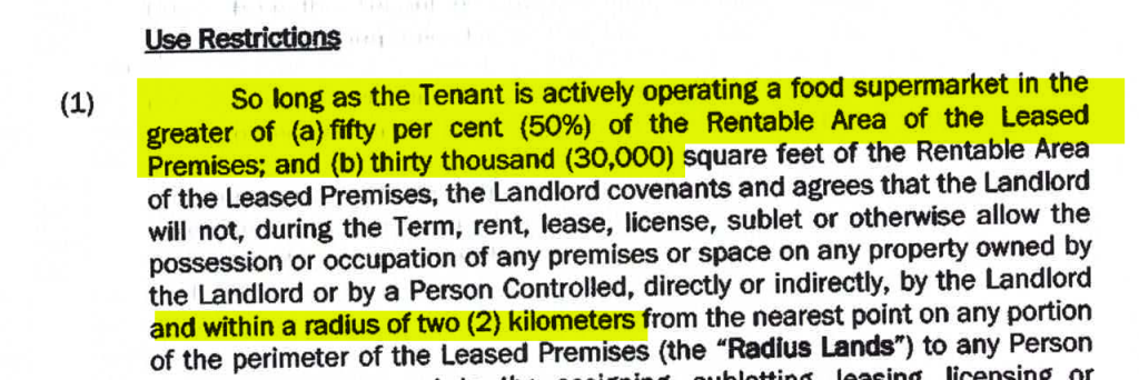 The contract with Loblaws specifies in minute detail which kind of tenants can be in the mall (no more than 1 dollar store, 1 cafe, 1 pet store), forbids awful stuff like cinemas or bowling alleys. It also includes a 2km radius condition forbidding CP REIT from renting to another grocery store at their other properties.