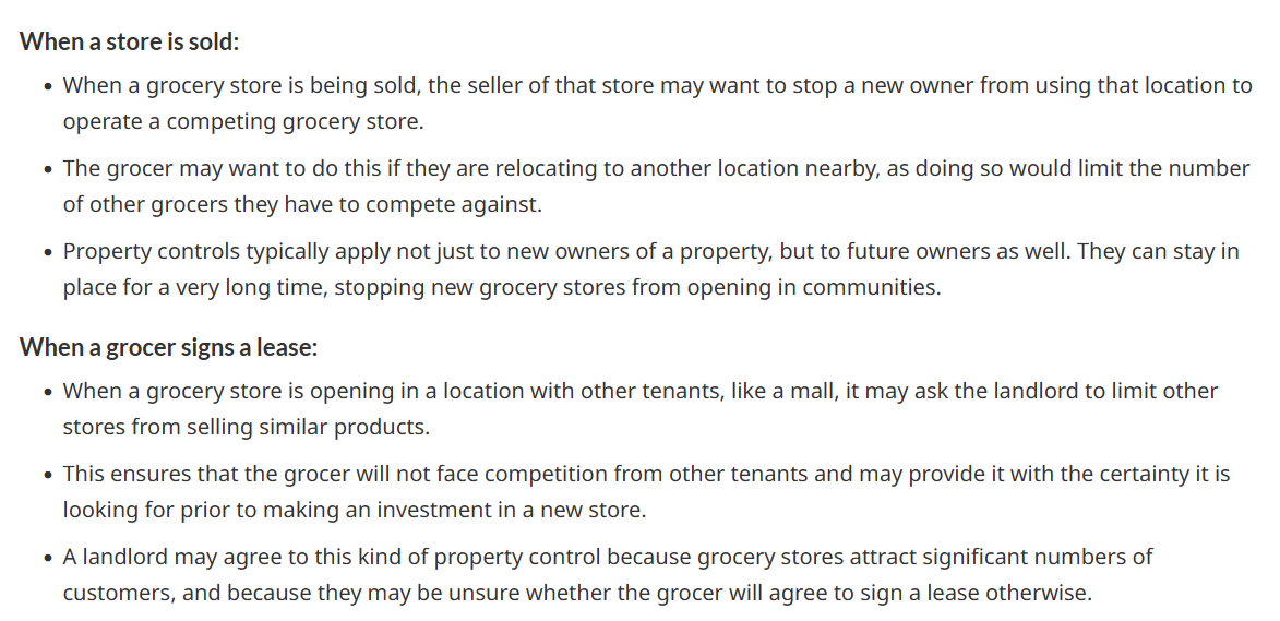 Here is a clear summary of how grocers use covenants to reduce competition, from a 2023 Grocery Market study by the Competition Bureau of Canada: