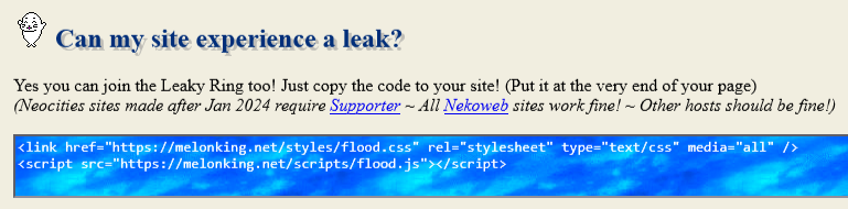 Melonking’s leaky webring – I was on a site, and it started filling up with water 😕. But fortunately it gave me a chance to bail the site and lower the level of water. That’s how I found out about Melonking’s super creative Leaky Ring: