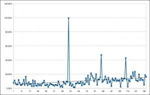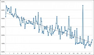 Before analyzing this data, we wondered if this "social emails" graph might come out flatter than the previous one, but to see it move upwards is kind of encouraging. I wouldn’t dare suggest this means that adding "Tweet this" and "Like" buttons are going to jack up your email ROI. I think this means that marketers who are combining their email and social efforts are generally trying harder to engage. And that things aren’t as dismal as the "Engagement Half-Life" research seems, because you don’t have to choose between over-emailing and under-emailing. You just need to use different tools in different ways to talk to your different customers.