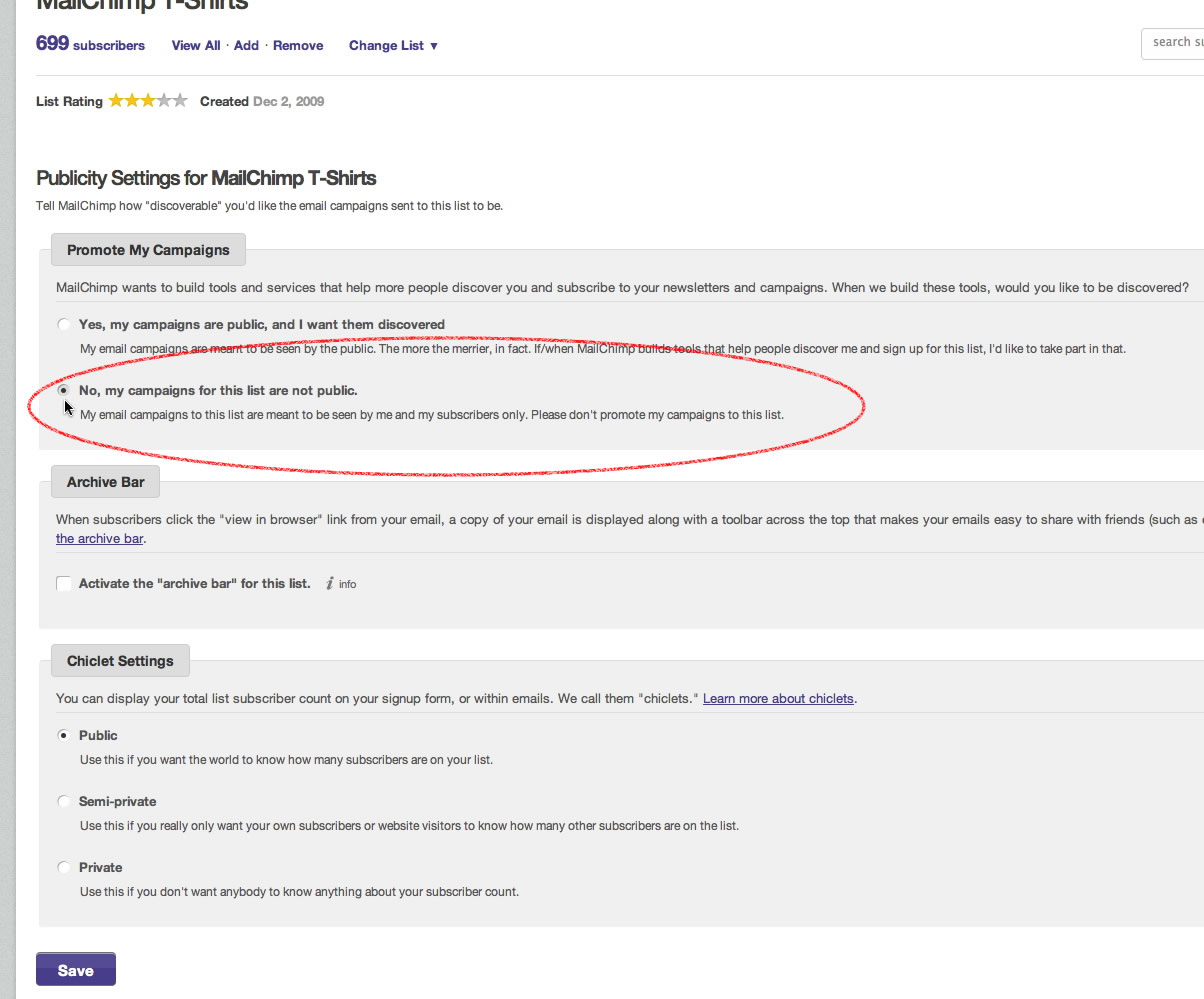 Usually, it’s an internal company newsletter, or a wedding invitation, or a one-time prize notification or transactional kind of message. The information in the email is not usually super private or sensitive (email is just not an extremely private medium), but it might be something that you don’t exactly want promoted, or something with expired content. Wavelength will almost always exclude these, because it won’t search lists that were only imported manually, it won’t include tiny lists or fresh new lists, and it won’t show campaigns sent to a segment of a list. For a campaign to be shown in Wavelength, its recipient list must be greater than 200 members, and show signs of being public. Namely, opt-ins were received from its public signup form, or the campaign archive bar (that thingy with all the social sharing buttons) is activated.