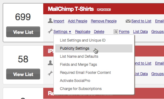 For example, I have my list where customers can sign up for a chance to win a t-shirt. For some reason, I just don’t want this to show up in Wavelength results. Maybe the t-shirt designs are top secret prototypes or something. For that list, I can go to "Publicity Settings:"
