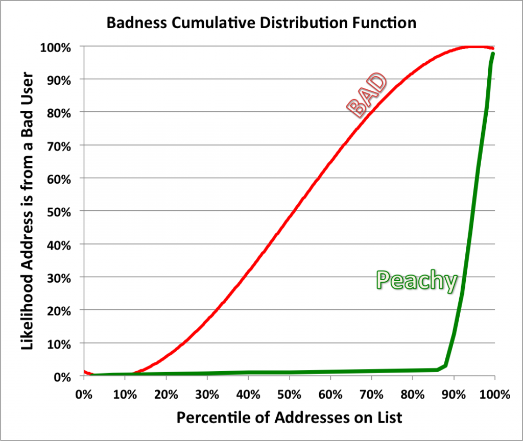 Now, once we’ve scored every address on a list, we combine those scores into a single cumulative curve. This curve is the user’s Badness CDF, and it’s one of many things that flows into our AI models. Here are two real-world examples of these curves: