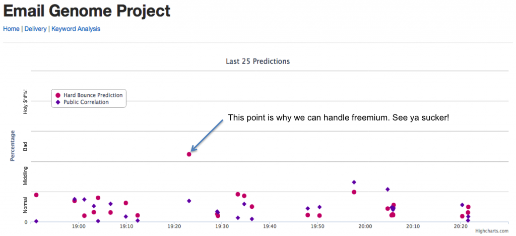 If you’re nice, you shouldn’t see any hurdles as you attempt to send newsletters or buy a larger account. Your predictions just bounce along the bottom of that graph, and Omnivore let’s you slide through. If Omnivore thinks you’re in a middle ground and may have some problems, you might be advised to clean up your list or may be allowed to send on a provisional basis. If Omnivore thinks you’re undoubtedly evil, you get its mechanical foot in your back as you’re shown the door.