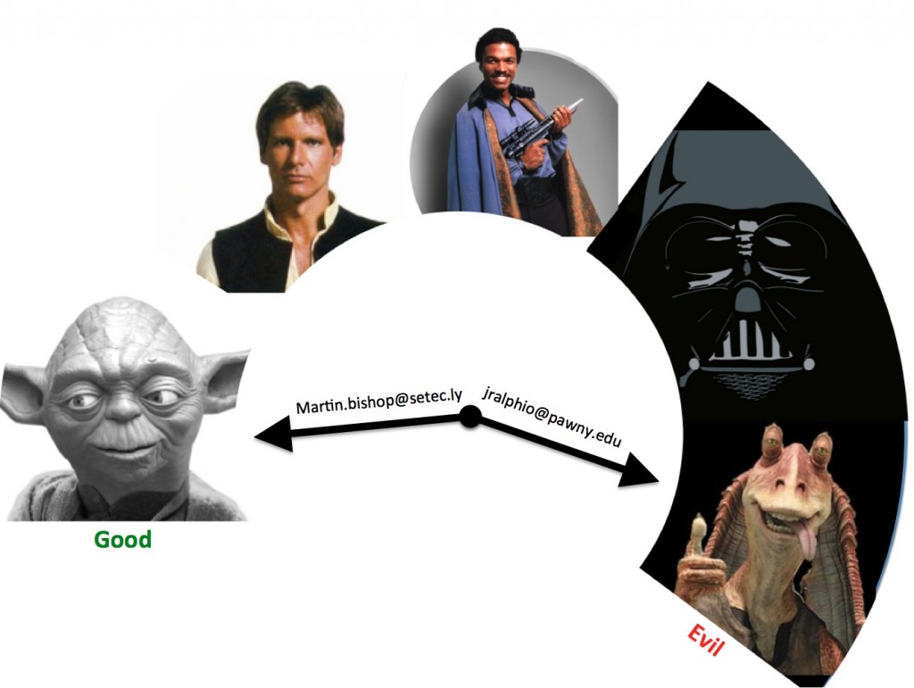 Let me break down what the BCDF is for you. Let’s assume we’ve got a heretofore unknown user. Each email address on that user’s list is a piece of evidence supporting whether the user is good or bad. So if you import 80,000 addresses into MailChimp, that’s 80,000 pieces of evidence telling us just how trustworthy you are. We score each email address from the user from 0 (good) to 1 (evil). There’s some secret sauce in here as to how this works so I’ll just replace our copyrighted genius with some Star Wars characters so that you’ll get the idea: