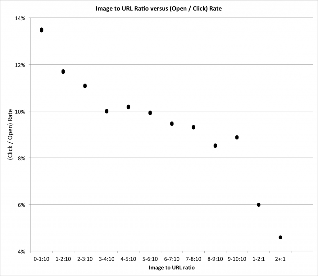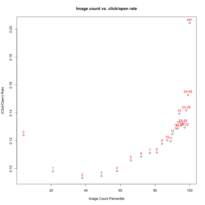 Now that’s better. What do we see? Well, the first thing I notice is this dip to the left. Text-only campaigns (hello spammers!) do better than those with 1-9 images. The next thing I notice is that once we hit two images, it’s all uphill from there. So more images means more clicks? Perhaps more images means you’ve put more care into designing your campaign, or it might mean you’ve got more relevant content to send. Or maybe we’re all just visual learners, and we really like pictures.
