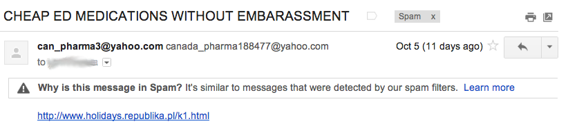 Are the spammers simple, lazy, or brilliant? Here’s a screenshot from my very own Gmail spam folder: