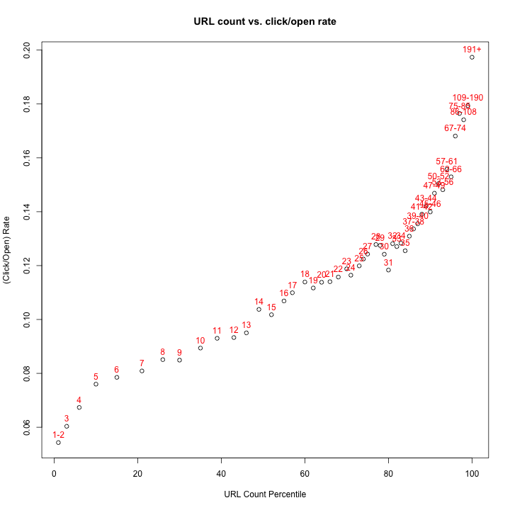 Also, there aren’t a lot of people who send 2003-word campaigns exactly, so I’ll be lumping url counts, image counts, and word counts into percentile buckets sometimes. Because I’m using percentiles, each bucket will have the same number of campaigns in it.