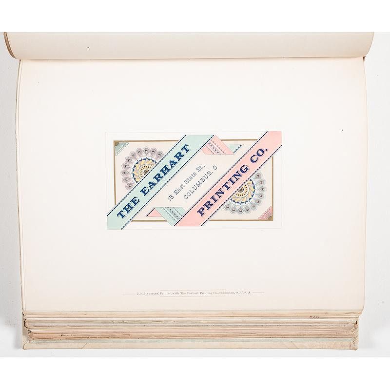 This volume includes a nice business card from printer Fred Wood. Those curled corners, moons and banners were made from scratch by bending brass rules. It is a strong display of technical skill.