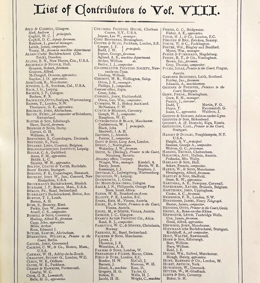 You see, in 1877 the Brits were holding a celebration of “400 years of printing” to commemorate William Caxton’s introduction of the first printing press to the Isles. At that event, the British public was invited to see examples of domestic and foreign printing. It wasn’t pretty: British printing was visibly behind that of the Austrians.